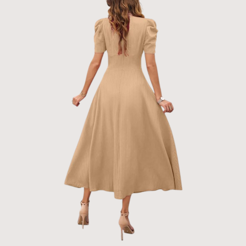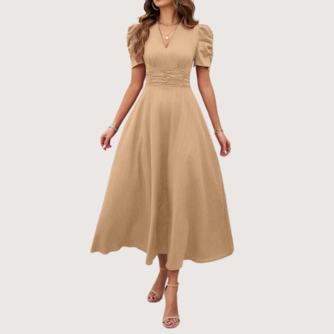 Style: V Neckline Waist Cinched Short Sleeve Dress